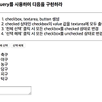 jQuery를 이용하여 체크박스 다루기 jQuery를 이용하여 Checkbox, Textarea, Button 을 다루는 실습을 해보자 소스코드1234567891011121314151617181920212223242526272829303132333435363738394041424344454647484950515253545556575859606162 jQuery를 이용하여 체크박스 다루기 function allSelect() { $("input[type='checkbox']").prop('checked', true); } function unSelect() { $("input[type='checkbox']").prop('checked', false); } function check() { var check..